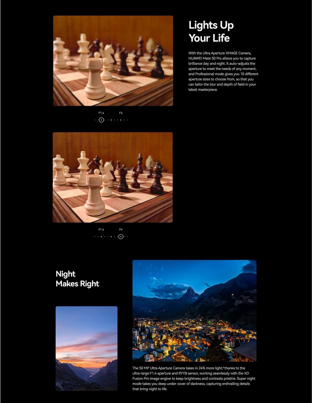 The new Ultra Aperture XMAGE camera with a F1.4 ultra-large aperture brings great night shot, professional-level portraits and unique XMAGE style. Thanks to the durable Kunlun Glass, up to 6-metre water resistance, a 4700 mAh battery, wired and wireless HUAWEI SuperCharge, enhanced privacy and security protection, HUAWEI Mate 50 Pro achieves great performance