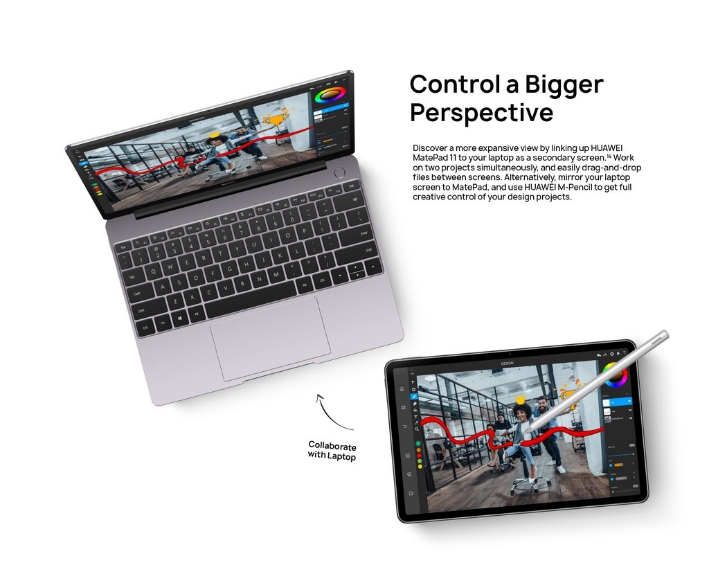 【Huawei Share】Work on two projects simultaneously, and easily drag-and-drop files between screens. Alternatively, mirror your laptop screen to MatePad, and use HUAWEI M-Pencil to get full creative control of your design projects.