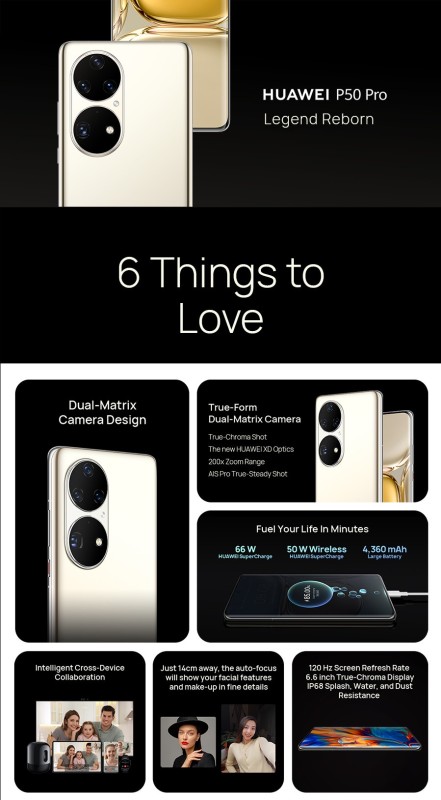HUAWEI P50 Pro delivers superior performance and push the boundary of smartphone photography. True-Form Dual-Matrix Camera enables you to capture what you see with original colours and elevated clarity. The upgraded portrait mode and new AI features help you create stories with great fun. The supreme iconic design “Legend Reborn”apply on the Dual-Matrix Camera. Intelligent Cross-Device Collaboration, Smart Folder provides the all-new interactive experience, Fitting the large screen and battery into a compact body, HUAWEI P50 Pro is lighter than the previous generation and a better fit in your hand which contains 66W wired and 50W wireless super charge with the 4360mAh battery.