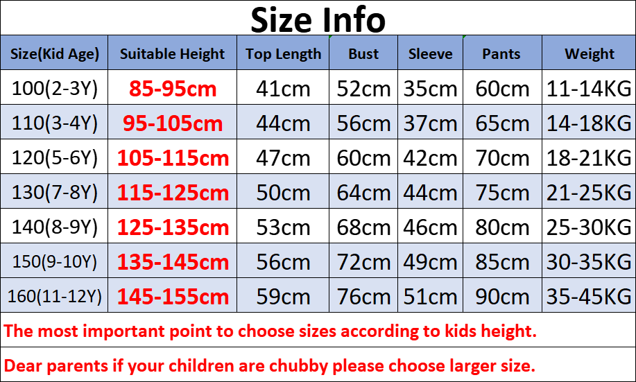 Please note the sizes for it doesn't fit all people. Please view the details of the size information before your purchase.Dear Parents if your children are chubby please choose larger size.Products include: 1*Tops+1* PantsNotes:1.Measurement of the item lying on the table may cause 1-3cm difference.2.The real color of the item may be slightly different from the pictures shown on website caused by many factors such as brightness of your monitor and light brightness when photo taking.3. You have any problem in the transaction, please communicate with us to solve the problem, Have a nice shopping day!
