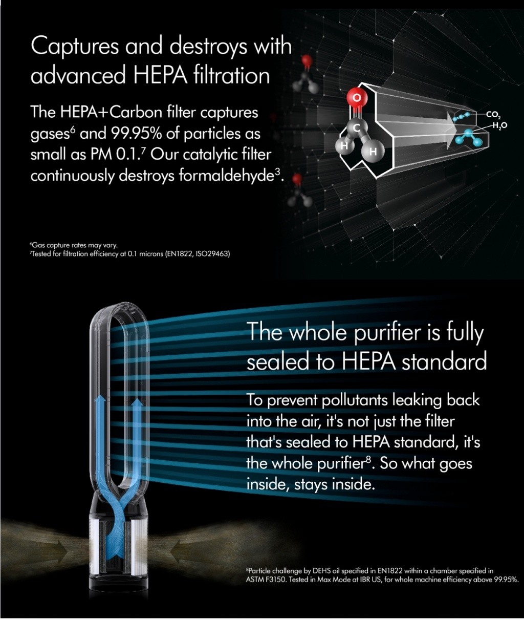 360° Glass HEPA filter captures ultrafine particles from the air including pollen, bacteria and pet dander.