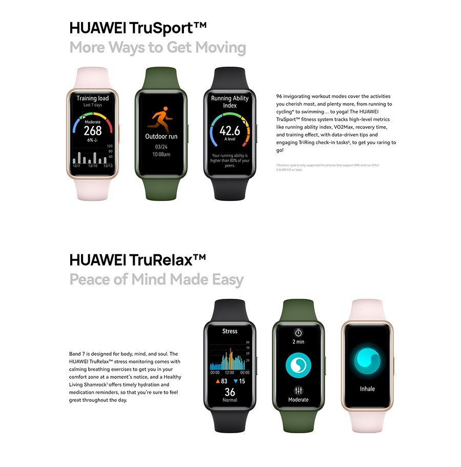• 【96 workout modes】: 96 invigorating workout modes cover the activities you cherish most, and plenty more, from running to cycling to swimming… to yoga! The HUAWEI TruSport fitness system tracks high-level metrics like running ability index, V02 max, recovery time, and training effect, with data-driven tips and engaging TriRing check-in tasks*****, to get you raring to go!