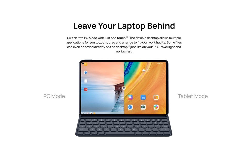 【Huawei Share, Multi-screen Collaboration】In Mirror Mode, your laptop display is mirrored on the tablet. In Extend Mode, a certain task on laptop could be dragged onto tablet, turning the tablet into a monitor. In Collaborate Mode, your tablet and laptop can share the laptop keyboard and the mouse.