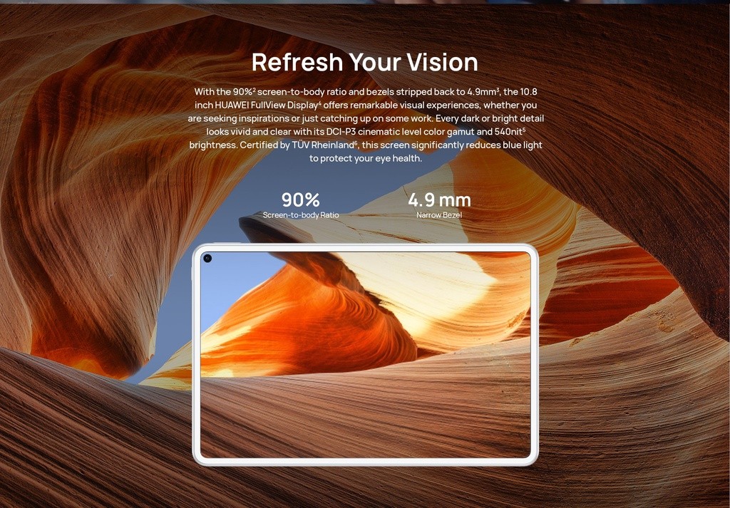 【10.8’’ HUAWEI FullView Display】With the 90% screen-to-body ratio and bezels stripped back to 4.9 mm, the 10.8-inch HUAWEI FullView Display offers remarkable visual experiences.