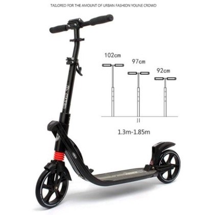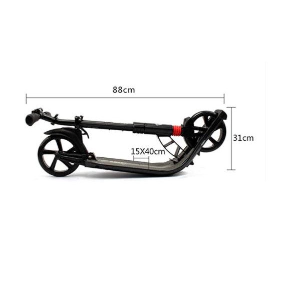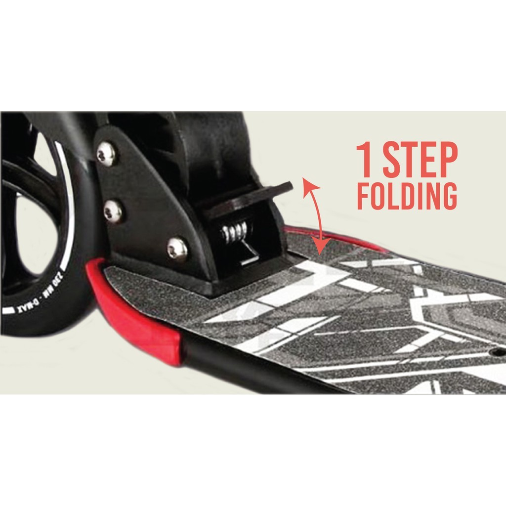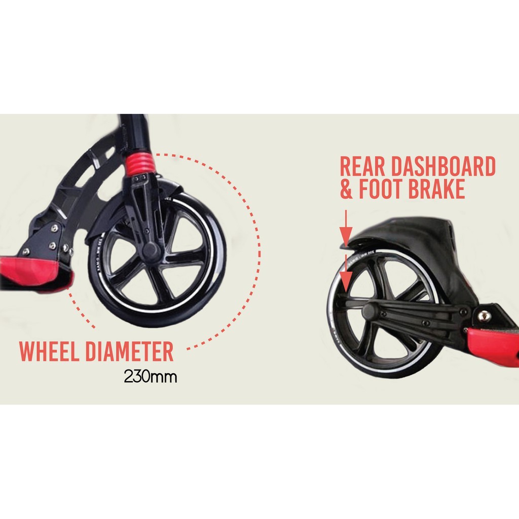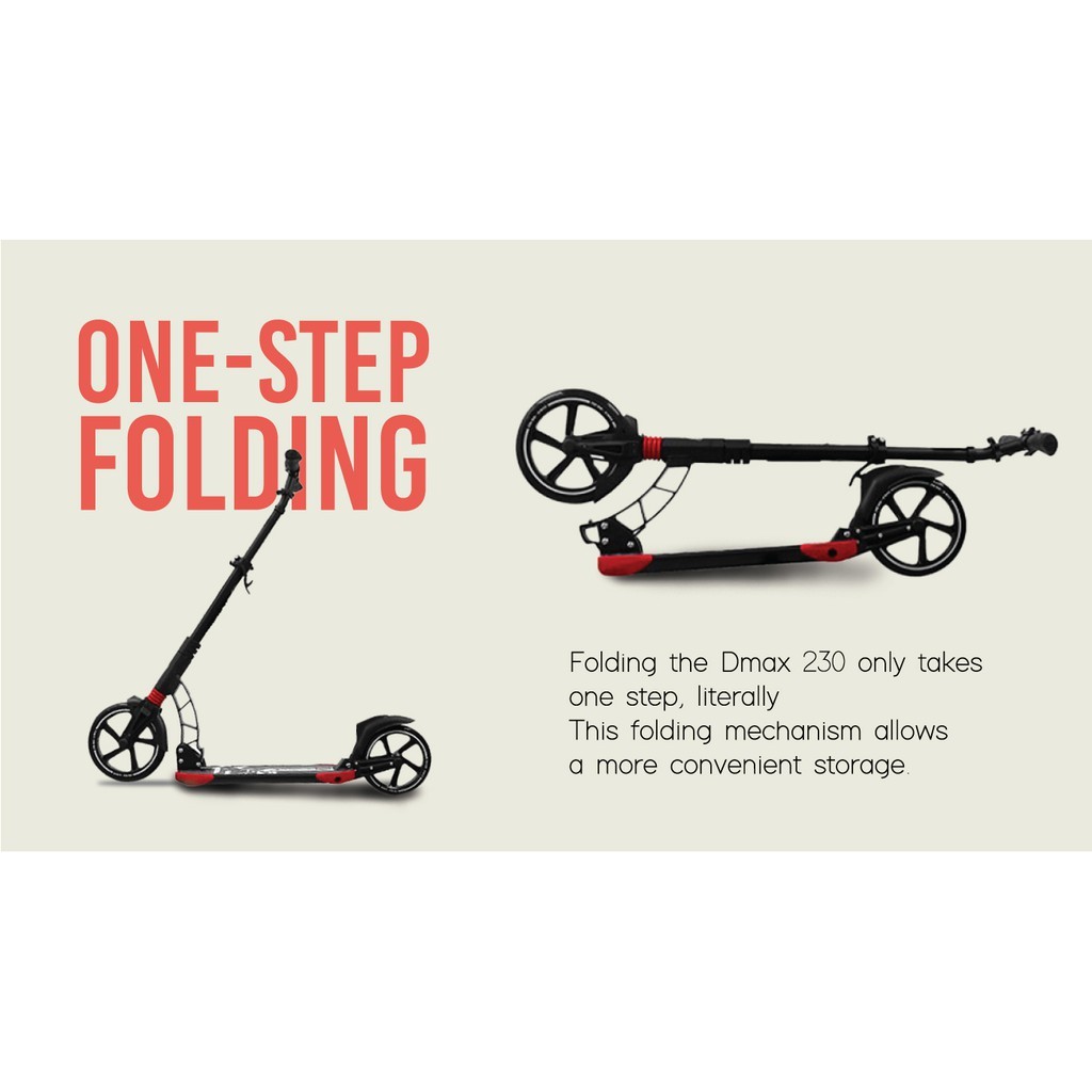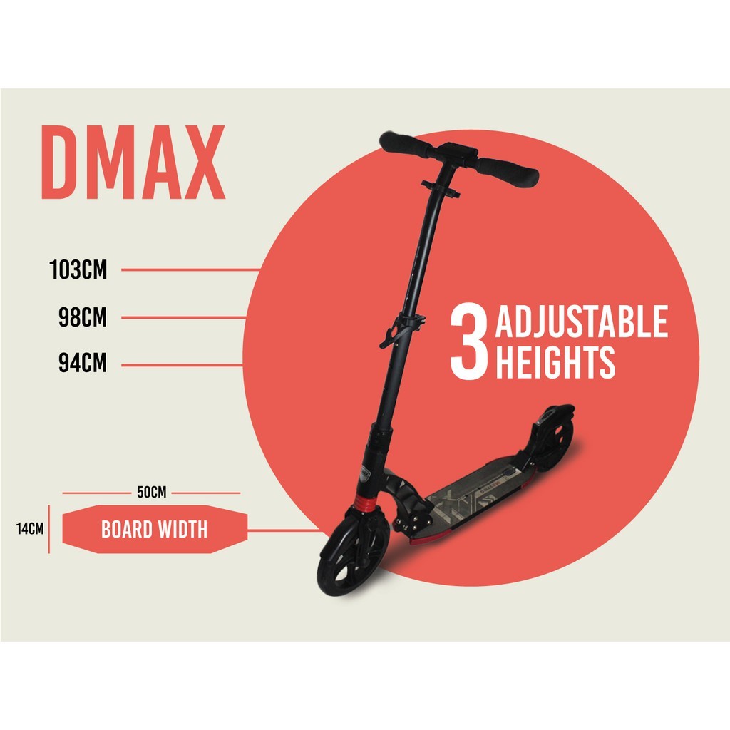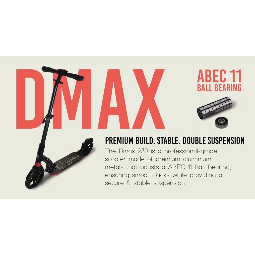 Smooth Ball Bearing and Slim standing board ABEC 11 Ball Bearing (Smoothest Bearing) What is bearing rating? The rating recognised in engineering is the ABEC standard, short for Annular Bearing Engineering Committee, named after the body that established the standard. The ABEC ratings are (from lowest precision to highest precision) 1, 3, 5, 7 and 9. Most kick scooters in the market use bearings rated ABEC 5 to 7. The higher the precision, the lower the rolling resistance/friction. Lower friction translates into a longer glide distance for every push. This can be readily experienced when riding a scooter, and is often what makes you feel or judge if a scooter is 'fast' or 'slow'. The Higher the ABEC rating, the tigher, more round, and better the individual bearings are inside the casings. Ball bearings are important for ultimately they are the reason we can all scoot and skate. ABEC 7 Less than 43,000 rpm ABEC 9 Less than 50,500 rpm ABEC 11 Less than 63,000 rpm The higher the grade of ball bearings, the smoother, longer and easier for you to scoot! What's best? A good ball bearing definitely gives you the most fun in scooting! A bigger scooter wheel will give more clearance to the ground which can be either a positive or negative aspect depending each and every rider. A larger wheel will have the ability to roll faster. Large wheels (200 & 230mm diameter) Advantages Longer glide distance per push (Better rolling efficiency) Better shock absorption More chances of rolling safely over random objects on the ground (like twigs, pebbles) or cracks Usually with larger deck for comfortable Professional Grade Scooter Enhance material - More firm and stable Front wheel 230mm wide Dual Suspension Weight: 6kg Max load: 120KG NEW! DMAX-9 More sleek plus bottle holder broader standing board